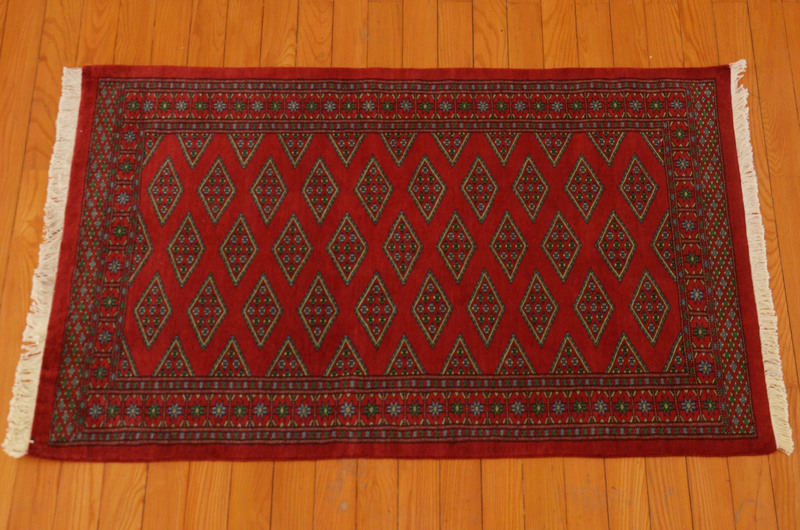 These rugs have fine traditional geometric patterns on solid background colors, generally in jewel tones. They tend to have velvety, plush piles and are very pliant (almost blanket-like) in texture. They are part of a very long tradition and heritage in various parts of Pakistan such as Multan, Kashmir, Hyderabad, Lahore and surrounding areas of the northeast region.