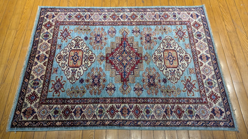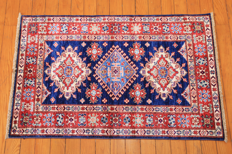 Kazaks are known for their indigo blues, reds and ivories, as well as their casual and warm appearance. Our Kazak rugs are almost entirely naturally-dyed, however, Kazak natural dyes are commercially farmed natural dyes (such as indigo and cochineal) and are therefore less labor intensive for our artisans than hand-gathered natural dyes. The reason for the phrase "almost entirely naturally-dyed" is because some artisans choose to augment their natural dyes with some commercially-available dyes in order to create the precise color they desire. The wool in Kazaks, like the wool found in Chobis and Gabbehs, is hand spun using a drop-spindle.
