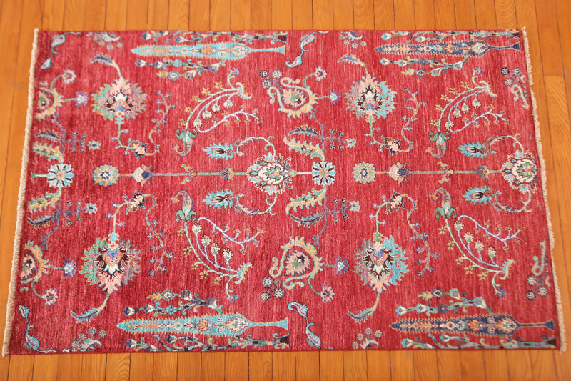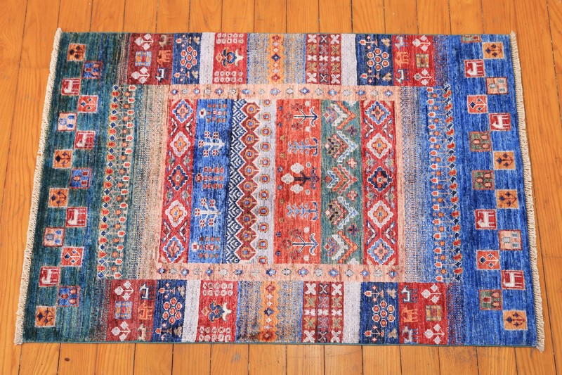 Chobi rugs are traditionally produced in many regions of Pakistan. The word "chobi" is from the Farsi word "chob" which means wood, referring to the source of its natural dyes. Our Chobis tend to have large geometric floral patterns. They are all hand-knotted with hand-spun wool spun primarily by a drop spindle. Their natural dyes are made entirely from hand-gathered fruits, vegetables, roots, tree barks and dried shells, making Chobis the most labor-intensive of all of our tribal carpets.