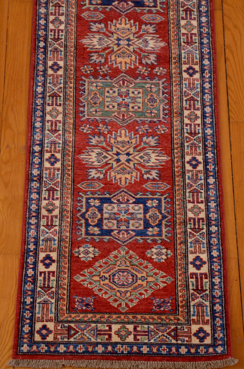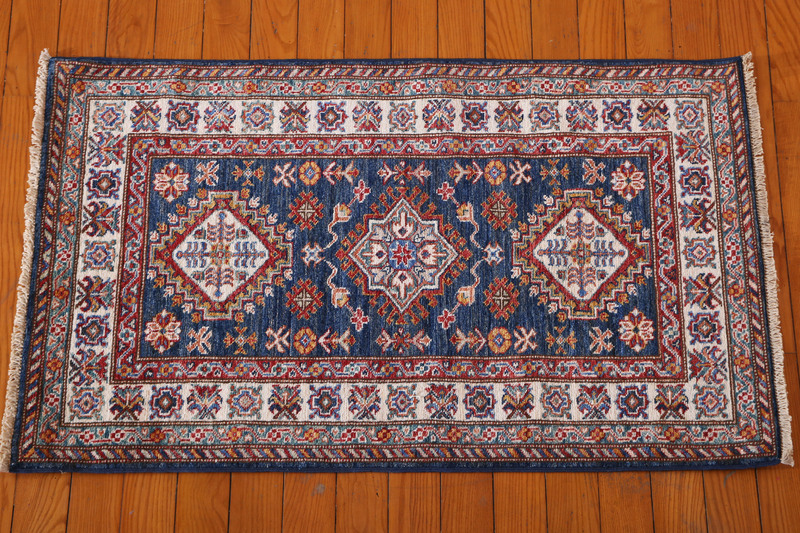 Kazaks are known for their indigo blues, reds and ivories, as well as their casual and warm appearance. Our Kazak rugs are almost entirely naturally-dyed, however, Kazak natural dyes are commercially farmed natural dyes (such as indigo and cochineal) and are therefore less labor intensive for our artisans than hand-gathered natural dyes. The reason for the phrase "almost entirely naturally-dyed" is because some artisans choose to augment their natural dyes with some commercially-available dyes in order to create the precise color they desire. The wool in Kazaks, like the wool found in Chobis and Gabbehs, is hand spun using a drop-spindle.