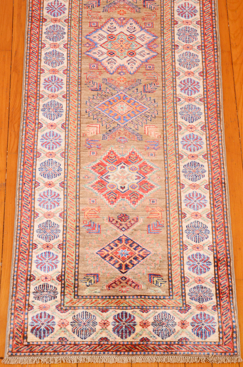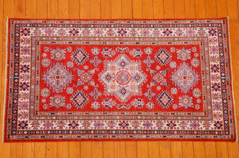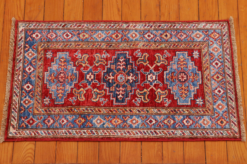 Kazaks are known for their indigo blues, reds and ivories, as well as their casual and warm appearance. Our Kazak rugs are almost entirely naturally-dyed, however, Kazak natural dyes are commercially farmed natural dyes (such as indigo and cochineal) and are therefore less labor intensive for our artisans than hand-gathered natural dyes. The reason for the phrase "almost entirely naturally-dyed" is because some artisans choose to augment their natural dyes with some commercially-available dyes in order to create the precise color they desire. The wool in Kazaks, like the wool found in Chobis and Gabbehs, is hand spun using a drop-spindle.
